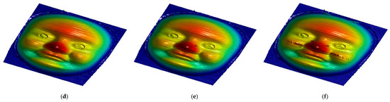 The recovered 3D results, (a–c) are conventional method and (d–f) are proposed method under different defocusing levels (From left to right: nearly focused, slightly defocused, and significantly defocused).