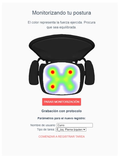 - The personal computer (PC) application: A user-friendly interface was designed to show measurements from the sensors and logging the data for further use. The application was developed in javascript and using the node.js and vue.js frameworks, as well as a heat map graphic representation library. The application is run through the browser and it guides the user for obtaining data for each different posture. It also uses promise-based calls both to request MCU pairing and to request sensor values, using the BLE protocol. A heat-map type representation was used to visualize the changes in the sensors in real time, as shown in Figure 3.