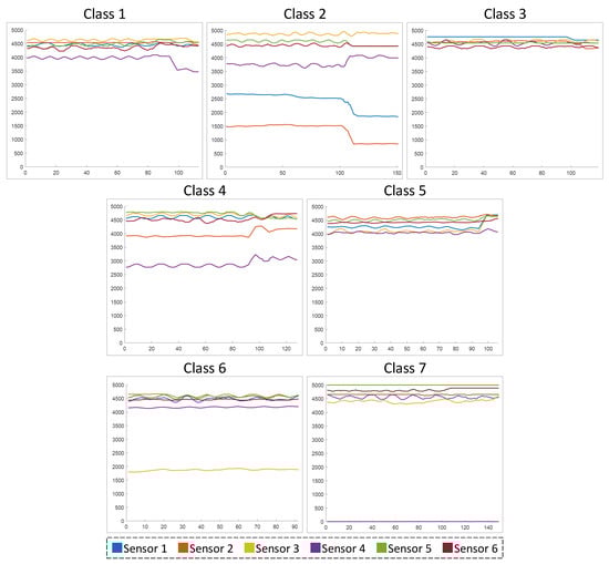 Data distribution distinguishing between the output of the six sensors for each class calculated on average for all the involved participants. These classes represent the seven postures considered for this work described in Table 1. Y axis represents the range of values that the sensors’ output could take, while X axis corresponds to the samples obtained over the recording time.