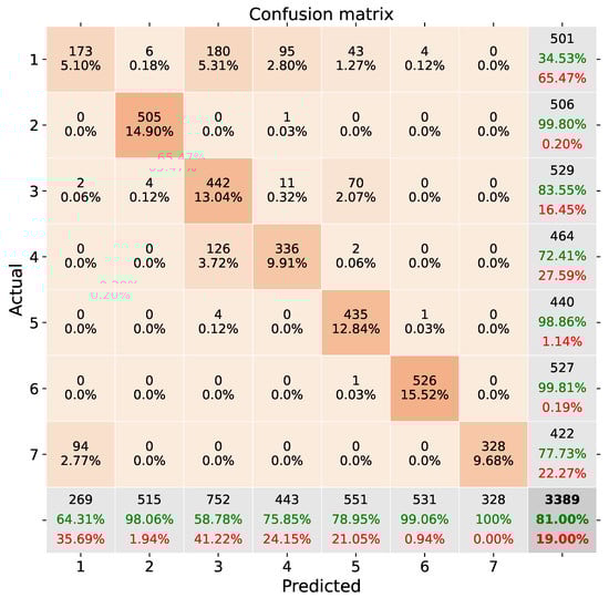 After this experiment, the best model was analyzed in detail in order to provide a deeper evaluation with the metrics presented in Section 3.4. The model achieved 96.40% specificity, 82.14% precision, 80.96% sensitivity, 80.24% F1 score, and 0.9672 AUC. In these results, the high value of specificity stands out, which denotes that the model has an overall high effectiveness at discarding classes to which a certain sample does not belong. The AUC is also high, which denotes a high reliability in the classification of the samples, in terms of probability. Figure 6 shows the confusion matrix for this model, where the whole test set (3369 samples from two users) was used. The X axis corresponds to the actual class (ground truth), and the Y axis represents the predictions performed by the model. In this regard, the last column for a specific ground truth class shows the sensitivity of the model for that class (using a one vs all approach), which is highlighted in green. In the same way, the last row for a specific predicted class presents its precision. The last cell in the major diagonal of the confusion matrix includes the overall accuracy obtained in the experiment.