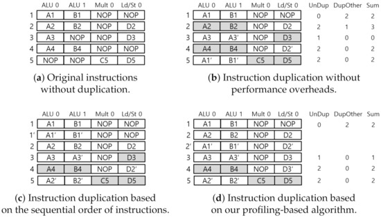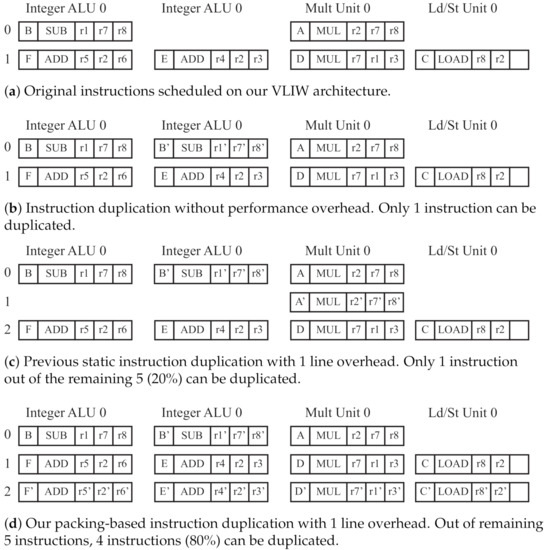 Several compilation techniques for VLIW architectures have been proposed in order to improve the performance or solve the dependency problems, e.g., reducing the number of NOPs or improving the scheduling algorithm [17]. However, the reliability of VLIW architectures has received much attention since VLIW architectures are commonly employed in “safety-critical” embedded systems such as aerospace, automotive, and rail transport applications [18]. In order to improve the reliability of VLIW architectures, several compiler-assisted instruction duplication [19,20] have been proposed by using NOPs and additional code lines. However, all the instructions in applications cannot be duplicated without performance overhead even though the complication techniques use the existing NOPs.