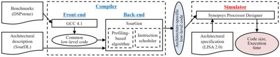 Figure 4 shows our experimental framework in order to present the efficacy of our packing-based duplication. All the benchmarks in this paper are code segments from DSPstone [32], digital signal processing-oriented applications. Note that code segments are selected in the loop since VLIW architecture is used to accelerate the loop iteration. This is because compilation techniques suppose 10 times of execution for instructions in the loop [33]. Thus, it can improve the overall performance when we accelerate instructions in a loop rather than other instructions since the loop takes up the majority of execution time. The high-level code from these benchmarks is translated to common low-level language via GCC (Version 4.1) at the front-end phase.