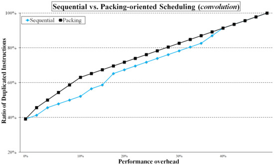 We need to allow more code lines to duplicate the remaining 61% of the entire instructions. In order to duplicate all the instructions for the benchmark convolution, almost half of the execution time is required as shown in Figure 5. If we allow 2% performance overhead for the benchmark convolution, the previous sequential scheme can duplicate only 41% of the remaining instructions. On the other hand, our packing-oriented scheme can duplicate 52% among entire instructions. If 11% of performance overhead is allowed by system engineers, only 64% of the remaining instructions can be duplicated by the sequential scheme, while our packing-oriented scheme can duplicate 39%.