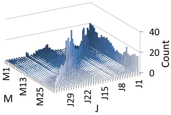 This sub-section will further perform the analysis of odds algorithm by applying it on two examples. As we know that odds algorithm works on probability. Therefore, the probability of intra modes is obtained for applying the odds algorithm. As current block in HEVC has neighboring blocks and due to their correlation with each other, the probability of intra mode J can be obtained by consulting the modes of the neighboring blocks. To obtain this probability matrix, first initialize a 35 × 35 matrix with zeros. Then, execute HEVC encoding process and whenever HEVC selects the intra mode for the current block, extract the intra mode of the above neighboring block (M). Then, go to J row and M column of this matrix and increment its value. After this, divide the J by the sum of all the Js present in this row and it will give the probability. In this work, we computed matrix only, using BasketballDrill test sequence to keep the computation minimum as this is fast intra mode decision algorithm. This matrix is shown in Figure 4. In Figure 4, x-axis represents M, y-axis represents J, and bars represent the count. Figure 4 shows that some modes have huge probability and some has less probability.