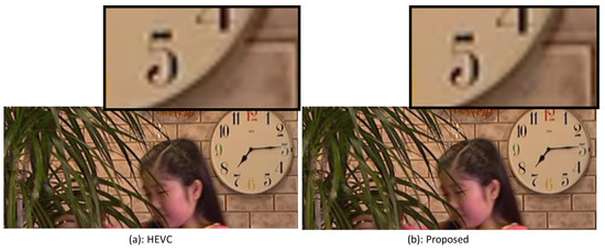 By changing the value of , one can see the difference in time saving, but what about the visual difference? The answer to this question is given in Figure 7. In Figure 7a, the value of is 0.5 and a PSNR comparison with the original picture is given in Figure 7c. Dark blue color in Figure 7c indicates exact match or difference is zero. Similarly, Figure 7b is encoded using = 0.3 and its PSNR difference with the original picture is shown in Figure 7d. Figure 7a,b clearly shows that there is no visual difference but time saving of = 0.3 is better. The application of the proposed model on another video sequence (PartyScene) is shown in Figure 8. For easy comparison, encoding result of HEVC is also shown in Figure 8. Visual results of Figure 8 show that there is not much difference and both the figures look almost the same.