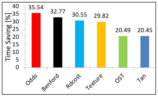 Figure 9 analyzes the proposed algorithm from another perspective. Figure 9 presents the time saving achieved by various algorithms of the literature. These algorithms include Benford [29] published in 2020, Rdcost [37] published in 2019, Texture [20] published in 2018, OST [36], and Tian [25] published in 2019. Figure 9 shows that the proposed algorithm saves a good amount of time.