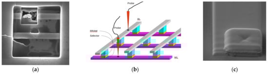 The RRAM-based technology is compatible with CMOS fabrication and is added at a backend process module. RRAMs layers are placed in the most external part of the chip in which the cross-point structures can be found [44]. From this, one immediate vulnerability can be identified by adversaries, who are able to apply reverse engineering techniques. As it is shown in Figure 2a, FIB equipment can be used to open access at row and column metal lines and to pin probes. From these, RRAM resistances can then be passively measured and bits are extracted. In Figure 2b a drawing illustrating this attack is shown and in Figure 2c it can be seen how probes can be pinned. Usually, the probes themselves cannot contact the lower layers through the opens but metallizations are added which bring the connections to the surface. This type of attack is usually prevented by adding protecting shields (active or passive). Anyhow, these shields are expensive and consume, at least, a full metallization layer [45].