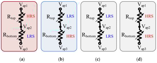 Data stored in the serial cell depends on the resistance state of the RRAMs: (a) ‘0’; (b) ‘1’; (c) Masked in the LRS; (d) Masked in the HRS.