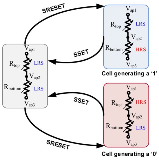 The considered serial RRAM memory cell is a kind of differential cell in which bits can be concealed. As shown in Figure 3, it consists of two RRAMs connected in series. Four different cell states can be identified from the two possible resistance states of each RRAM, see Figure 4: ‘0’, ‘1’, , . The behavior of the cell is as follows: with the two RRAMs initially in the , during a serial RESET (SRESET), i.e., a RESET operation of the two serially connected devices, one of the RRAMs switches to the HRS first. When the SRESET is initiated, the voltage across the switching device increases, preventing the other device to switch. During a subsequent serial SET (SSET), i.e., a SET operation of the two serially connected devices, only the RRAM in the switches back to the , since the other one is already in the . For subsequent SSET and SRESET the switching device is always the same. The basic operation of the cell is reported in Figure 5. Furthermore, considering the unused configuration in which both RRAMs are masked in the HRS, one of the RRAMs switches first to the LRS in the subsequent SSET operation, which raises the voltage across the other non-switching RRAM device, forcing it to switch to the LRS as well. In this case, both devices may end up in the LRS if the SSET voltage is not withdrawn in time, compromising the functionality of the cell. That is the main reason why this configuration (HRS, HRS) is not adopted here. Given a particular pair of devices initially in the LRS, by applying consecutive SRESET and SSET operations the bit can be unmasked and masked, respectively. Depending on which of the RRAMs switches to the after a SRESET, two different states of the cell can be differentiated (the so-called ‘0’ or ‘1’). The RRAM that goes first to the depends on device-to-device variability. Therefore, every cell generates an unpredictable bit, which is maintained during subsequent SRESET and SSET operations. Furthermore, it adds masking capability since both devices remain in the after a SSET. This fact can be exploited to generate unpredictable bits with the potential application in PUFs [38].