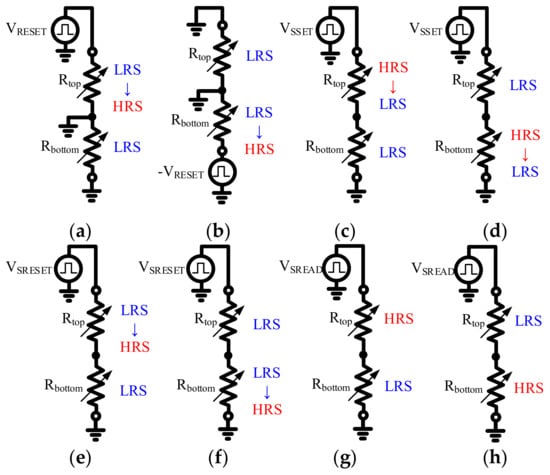 This serial RRAM cell is proposed in the present work for secure NVMs. However, for this application, we must include writing capabilities to obtain a full operational memory cell. This fact requires the capability of writing data to the cell while maintaining the feature of masking/unmasking the bit. For this purpose, during the write operation, individual SET and RESET operations are applied so that the middle node is grounded and nodes and are biased accordingly, as illustrated in Figure 6a,b for write-0 and write-1 operations, respectively. During masking and unmasking operations the middle node is left floating and voltages at nodes and are applied accordingly. The masking operation is performed by bringing the two RRAMs to with a SSET, which forces the same current passing through both devices, see Figure 6c,d. After this operation, it is arduous to know what the previous combination of states or was. However, if an unmasking operation (SRESET) is applied (forcing the same current through both devices) the previous state or is restored, see Figure 6e,f. With the cell in an unmasked state, a read operation (SREAD) is conducted, as illustrated in Figure 6g,h. Node is grounded and the read voltage is applied to node while the voltage at the floating node is measured and compared to a reference voltage to read the bit. The complete behavior of the cell is demonstrated next.