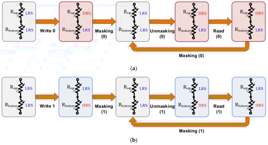 The resistances of the devices derived from the results in Figure 13 are represented in Figure 14. After the unmasking operation (Figure 14a) both devices are in different resistance states, depending on which value was written to the cell in advance. However, once masked, both devices remain in the . The resistance values are quite similar regardless of the value initially stored in the cell, as observed in Figure 14b. Therefore, these results demonstrate that we can deterministically determine the switching RRAM of the cell, i.e., writing the desired data to the cell (0 or 1), and we can subsequently mask and unmask the previous written data repeatedly.
