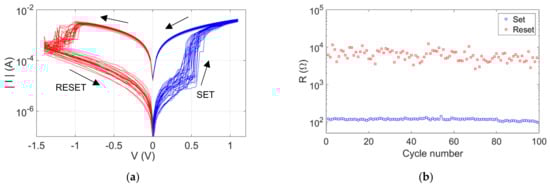 (a) DC resistive switching behavior during successive SET and RESET operations; (b) Resistances during pulsed SET and RESET operations.