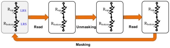 The serial cell provides also the feature of rewriting the content, maintaining the masking capability, as it has been previously shown in Figure 17. This fact paves the way for memory reconfiguration, which can be utilized to update the information or for fresh re-keying [47,48]. When the original key has been revealed or the ownership is revoked and the user needs a new key, this scheme is useful, which can also limit the side-channel exposure of per-key. In fact, the same scheme can be also used for shredding when the key is no longer needed. In any case, it must be taken into account that a memory array based on the serial RRAM cell can be combined with other existing security features, at different levels, to improve the security performance of the resulting primitive.