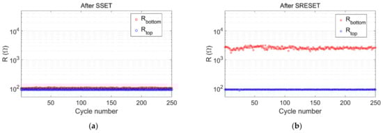 Measured resistances of a serial RRAM cell during a sequence of 250 serial operation cycles. No current compliance limit was imposed during SSET: (a) After masking (After SSET); (b) After unmasking (After SRESET).