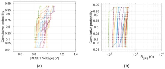 Cumulative probability obtained from 15 different single devices (color lines identify each device) corresponding to 25 DC cycles: (a) RESET voltage (); (b) Resistance in the ().