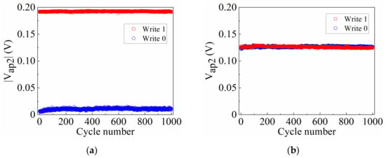 The first experiment was devoted to checking the ability to unmask and mask the bit written in the cell. The sequence of operations was similar to the one shown in Figure 7. The only difference is that we included an extra read operation to check the state of the cell after masking, which would not be required in normal operation mode. Hence, starting from both devices in the , a write-0 operation was applied, followed by a sequence of 1000 unmasking-read-masking-read operations. The equivalent experiment was also conducted with an initial write-1 operation. The voltage measured at the common terminal of the two devices () during the SREAD operation is shown in Figure 13a,b after an unmasking and masking operation, respectively. It is observed that the stored bit can be unmasked and masked 1000 times. After unmasking, the measured voltage is close to 0 V when ‘0’ was initially written to the cell. On the contrary, the measured voltage was close to 0.2 V () when ‘1’ was initially written in the cell. However, an intermediate voltage was measured after masking regardless of the initial written value. In fact, the two sets of voltage measurements are overlapped. Thus, it is unlikely to predict whether ‘0’ or ‘1’ is stored under the masked state.