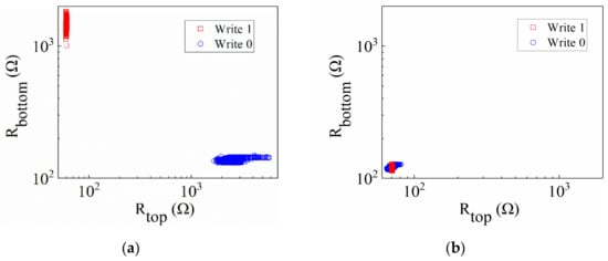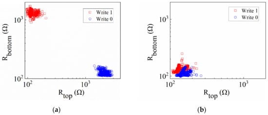 The final experiment focused on observing the behavior of the cell in case we want to modify the bit stored in the cell. For this purpose, a sequence of 1000 write-masking-read-unmasking-read operations was applied, where the write operations (write-0 or write-1) were randomly selected. An illustrative example of the behavior of the cell is reported in Figure 17. The resistances of the two devices are derived from the read operations after unmasking (Figure 17a) and masking (Figure 17b). The switching device is always the expected RRAM, according to the value written to the cell. Furthermore, the resistances in the of the two RRAMs are very similar in the masked state regardless of the previous write operation. In fact, the two sets of points overlap, as observed in Figure 17b. This feature, which allows rewriting the cell many times, confirm the use of this cell as a memory cell. In fact, it can also be exploited for reconfiguration purposes or the removal of the information stored in the cell in those applications where the information is rarely updated. In fact, these results, together with the capability of masking and unmasking the data, confirm the suitability of this cell for application in secure NVMs.