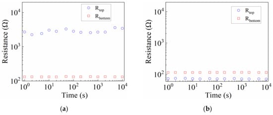 Resistance values of the RRAMs during unmasking-masking operation for 104 s. Initially, ‘0’ was written to the cell: (a) after unmasking; (b) after masking.