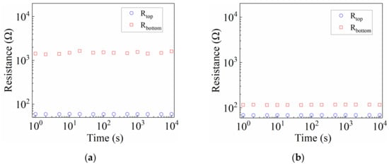 Experiments were also conducted to check the behavior of the masked bit over time. In particular, the goal consisted in extending the masked state for 104 s, verifying throughout the experiment that it was stored (masked) successfully. The corresponding results showing the resistance values of the RRAMs are shown in Figure 15a,b when ‘0’ was initially written to the cell. The equivalent values are presented in Figure 16a,b when ‘1’ was initially written to the cell. The results confirm that the bit can be unmasked and masked for at least 104 s.
