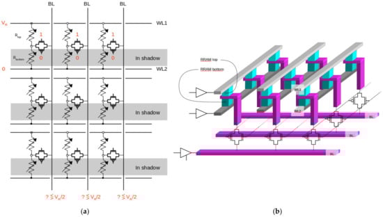 Serial RRAM memory array. (a) Schematic distribution of elements. RRAMs (Rbottom) in the shadow area are built under Rtop RRAMs, so that they become shielded (protected) against physical attacks. (b) A 3D view of the structure.