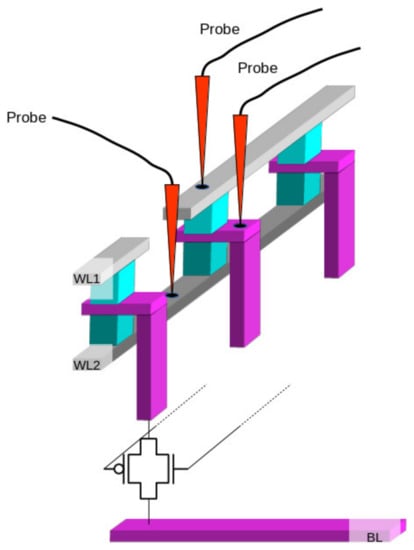 Measuring the two RRAM resistances of the serial cell requires access to line WL2 with a probe. In this configuration, it forces a cut in WL1 which will break the memory array functionality.