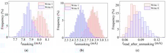 Quiescent Current histogram of cell 1 for 1000 cycles during: (a) Masking; (b) Unmasking; (c) Read after unmasking.