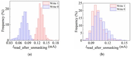 Measured voltage values at the common terminal of the two devices () during SREAD: (a) after unmasking; (b) after masking. The operations were repeated 1000 times after initially applying a write-1 and a write-0 operation.