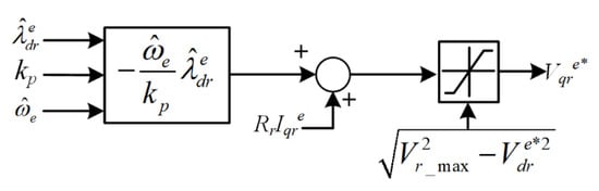 where Kps and Kis denote the proportional and integral gains of the stator d-axis and q-axis current controllers, respectively; Kpr and Kir are the proportional and integral gains of the rotor d-axis current controller, respectively; Vds_ffe, Vqs_ffe, and Vdr_ffe correspond to the feed-forwarding compensation components of the stator d-axis, the stator q-axis, and rotor d-axis current controllers, respectively. The coupling interference components can be obtained from the phase voltage equations of (1)–(3), and each feed-forwarding compensation value to remove the coupling interferences between the three current controllers is set as follows