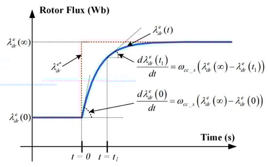 In the proposed current controller, since the transfer function of the rotor flux control is determined as the first-order low-pass filter according to the design of the current controller, the rotor flux changes are determined according to the transfer function of the current controller. Therefore, for a given stepwise rotor flux reference change, the change of the rotor flux appears as in Figure 5, and the derivative value of the rotor flux is determined by the bandwidth of the current controller as follows