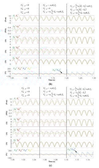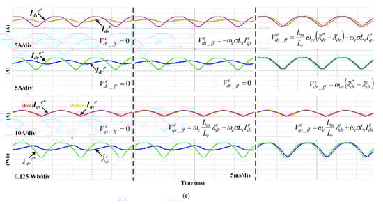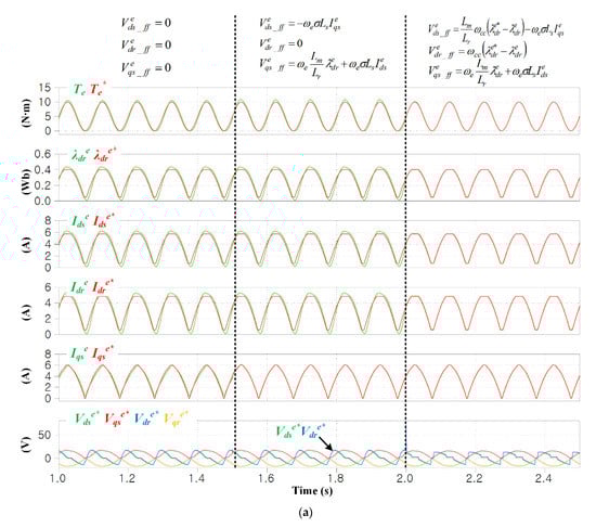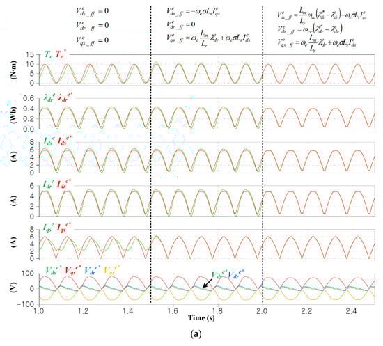 Figure 6a–c shows the performance of the torque, rotor flux, and current control with the voltage references on both sides. Here, the operating speed was fixed to 200 r/min, which corresponds to a low speed below the rated speed, and the cutoff frequency and nr were set to 300 Hz and 100, respectively. In Figure 6a, the torque command was set to swing from 0 to 10 N∙m in a sinusoidal manner of 10 Hz. Here, considering the rated rotor flux condition of (31), the d-axis stator and rotor currents were limited in the torque region of approximately 9 N∙m or more. The simulation consisted of the three control modes mentioned above. First, the stator q-axis current was well controlled in all control modes according to the designed current control bandwidth. However, the stator and rotor d-axis currents had errors and delays, except for the third case of the proposed method. Although the components proportional to the synchronous frequency were compensated in the second control mode, the results of the d-axis currents were significantly different from the proposed method. This means that when the rotor flux is adjusted according to the torque command for the MCL operation, the derivative term of the rotor flux component acts as a major coupling component. Therefore, if this derivative component is not compensated, the performance of not only the rotor flux control but also the torque control is greatly degraded, as shown in Figure 6a. On the contrary, when the proposed method was applied, the current, rotor flux, and torque were controlled with the designed bandwidth. The bottom waveforms show that the synchronous voltage commands had different patterns with the two conventional control modes. Especially, the pattern changes of the d-axis stator and rotor voltages to compensate for the derivative term of the rotor flux are evident.