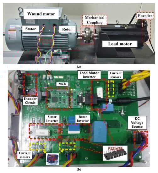 Experimental verifications were carried out on the wound machine and inverters, of which the specifications are shown in Table 1. Figure 8 shows a diagram of the experimental set-up, where a surface mounted permanent magnet (SPM) servo motor was coupled as a load motor through a mechanical coupling. Also, an incremental encoder of 2000 pulse-per-revolution equipped to the SPM servo motor was used for the filed orientation as in Figure 4. The DIFWM and the load motor were operated in the torque control mode and the speed control mode, respectively. Figure 9a,b show photographs of the dynamo set and the inverter set used in the experiments. Three intelligent power modules (PS21A79) were used as inverters for the DIFWM and the load motor, and all inverters shared the same dc link sourced by the external dc power as shown in Figure 8. Additionally, each inverter had two current hall sensors (CAS-25-NP) and the measured currents were used for not only the feed-back control but also the estimation of the rotor flux as in Figure 4. The inverters and current sensors were equipped to the bottom side of the inverter board.