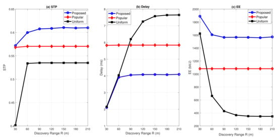 Figure 2 illustrates the relationship between the discovery range and STP, delay, and EE. The figure shows that STP increases with the discovery range for all schemes, which is because the typical user has a higher association probability with the F-APs as the discovery range increases. However, this increase is small in the Popular scheme as the F-APs cache only the most popular content, whereas the other contents can only be served by the transit F-APs. Moreover, due to the higher probability of the transit F-APs in the Popular scheme compared with the Uniform scheme, which is owing to caching only the most popular content at the F-APs, the Popular scheme achieves higher STPs than the Uniform scheme. The figure also shows that the delay of all schemes increases with the increase in the discovery range. This is mainly due to the high delay of the backhaul link as the probability of serving the requested contents by the transit F-APs increases with the discovery range. In the low discovery ranges (i.e., <90 m), the Popular scheme performs worse than the Uniform scheme due to its higher probability of using the transit F-APs. However, as the range increases beyond 90 m, the average delay of the Uniform scheme becomes higher than the Popular scheme, which is due to the higher separation distances between the requester and its serving F-AP. It is also observed that EE decreases with the discovery range as a result of the higher dissipated power since the contents require higher average number of time slots to be delivered successfully to the requester. The figure also demonstrates that the proposed scheme outperforms the benchmark schemes, which is due to optimizing the cache placement at the F-APs, where up to 15% STP, 45% delay, and 350% EE improvements over the benchmark schemes are observed at ranges greater than 150 m.