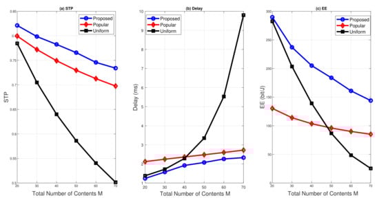 In Figure 4, we plot STP, delay, and EE versus the total number of cached contents M. It is observed that the proposed scheme outperforms the benchmark schemes, and STP, delay and EE degrade with the increase in the total number of cached contents for all schemes, which is due to the lower popularity of the contents, the smaller percentage of contents that are cached by the F-APs within the discovery range, and the C-APs’ poor dissemination of contents as the transmission bandwidth is shared by a higher number of them. Moreover, the figure shows that the Uniform scheme is severely impacted by the total number of contents as the requester is often served by a direct F-AP.