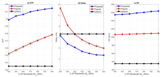 Figure 6 illustrates the relationship between the C-APs’ bandwidth and STP, delay, and EE. Figure 6 shows that the proposed scheme achieves higher STPs and EEs and lower average delays than the benchmark schemes. It also shows that the performance of schemes improves with the C-APs’ bandwidth, which is due to the improvement in disseminating the contents by C-APs. It can be seen that the C-APs’ bandwidth has higher impact on the Popular scheme because the contents are often served by the transit F-APs.