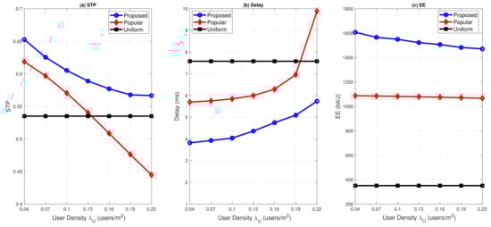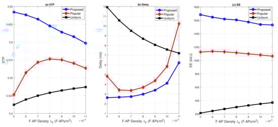 Figure 7 plots STP, delay, and EE versus the user density . We can see that the performance of the proposed and Popular schemes degrades with the increase in the user density. This can be explained as follows. As both schemes are highly relying on serving the requested contents by the transit F-APs, requesting the cached contents by a higher number of end-users results in a lower probability of operating F-APs in the transit mode, which in turn degrades the performance. The user density has no influence on the Uniform scheme as contents are often served by direct F-APs. It can also be seen that the proposed scheme outperforms the benchmark schemes, which is due to optimizing the cache placement to provide the best utilization of the F-APs as transit or direct F-APs that reduces the impact of increasing the user density on the performance.