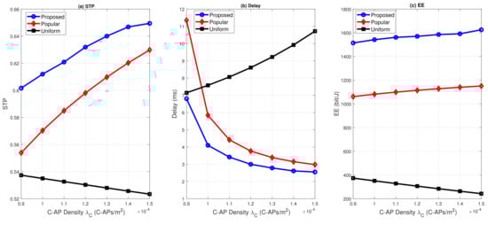 In Figure 9, we plot STP, delay, and EE versus the C-AP density . It is observed that the proposed and Popular caching schemes performs better with the increase in the C-AP density, which is due to the higher performance of the transit F-APs. The performance of the Uniform scheme degrades with the C-AP density, which is because the contents are often served by direct F-APs, and thus the increase in C-APs density results in high accumulated interference that degrades the performance. The figure also shows that the proposed scheme achieves higher performance than the benchmark schemes.