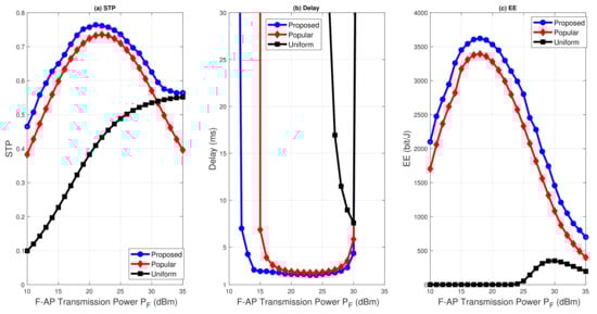 STP, delay, and EE versus F-APs’ transmission power when contents, users/m, F-APs/m, C-APs/m, m, , , dBm, dBm, , MHz, MHz, ms, and Mbps.
