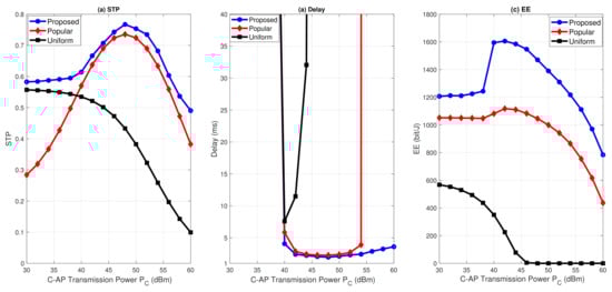 Figure 11 illustrates the relationship between the C-APs’ transmission power and STP, delay, and EE. The figure shows that the STP of the Uniform scheme decreases with the C-APs’ transmission power, which is because the gained improvement in fetching the contents from C-APs by transit F-APs is very low owing to the low probability of association with the transit F-APs, which cannot compensate the higher generated interference that degrades the performance of the direct F-APs that dominate the performance of the scheme. Even if the probability of utilizing transit F-APs is very low in the Uniform scheme, the delays over the links between C-APs and transit F-APs is extremely high when the C-APs’ transmission power is below 40 dBm, which in turns results in high average delays of the scheme. However, with the increase in the C-APs’ transmission power, the average delay of the Uniform scheme becomes lower. Then, it increases fast when the interference originating from the F-APs starts to severely impact the performance of the F-APs. The same behavior of the delay is observed in the proposed and Popular schemes. However, both schemes achieve lower optimum delays than the Uniform scheme as both utilize transit F-APs more. The figure also shows the EE of the Uniform scheme decreases with the C-APs’ transmission power, which is because the gained improvement in the performance of the transit F-APs by the higher power consumption cannot compensate the degradation in the performance of direct F-APs caused by the higher interference as the scheme is dominated by direct F-APs. It is observed that the STP and EE of the proposed and Popular schemes increase first with the C-APs’ transmission power, which is due to performance improvement on the links from C-APs to transit F-APs. After reaching the optimal value, the STP and EE of the proposed and Popular schemes start to decrease with the C-APs’ transmission power as the performance degradation on the links between F-APs and the end-user caused by the higher interference becomes higher than the performance improvement on the links from C-APs to transit F-APs. Finally, we can observe that the proposed scheme always outperforms the benchmark schemes as a result of optimizing the cache placement.