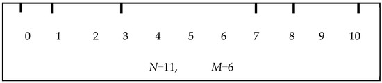 Autocovariance of a signal is equivalent to its autocorrelation when the signal mean is zero [31], and it will be referred to throughout the remainder of this paper as covariance for simplicity. CCS recovers the covariance of a signal from a compressed version of it when the compression is carried out by further sampling the signal using a linear sparse ruler (LSR) [16]. An LSR with a length of N−1, N = 11, is shown in Figure 1. The M = 6 marks on the ruler defined by the set {0,1,3,7,8,10} allow all integer distances between zero and 10 to be measured, which can be easily verified.