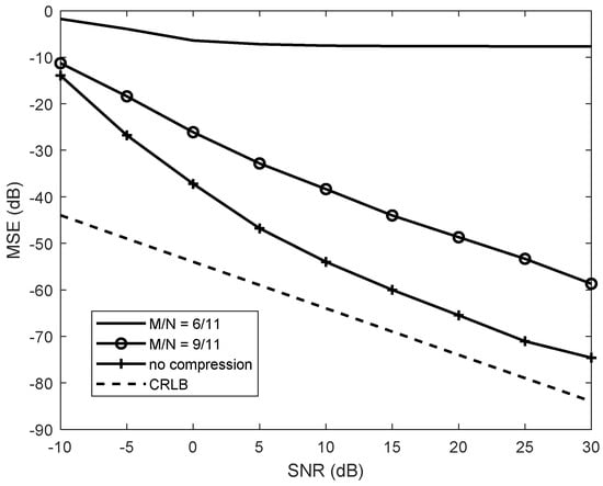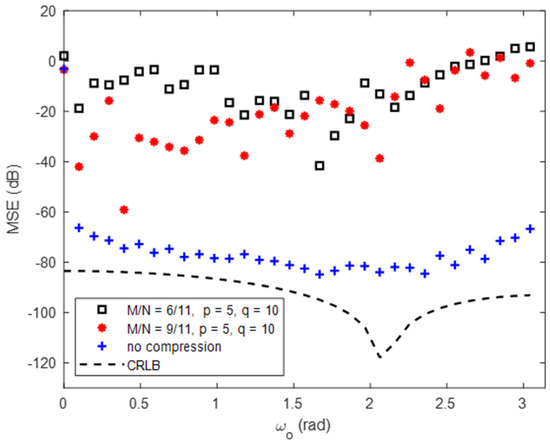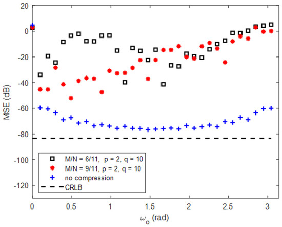 Finally, the frequency estimation MSE as a function of for the white noise case and the colored noise case is shown in Figure 6 and Figure 7, respectively, and for SNR = 30 dB. In Figure 6, the values of p and q are taken as 2 and 10, respectively. Increasing the number of the CCS-recovered autocorrelation lags results in better performance. The no-compression case clearly approaches the CRLB. Performance is compromised as expected when the required compression operation is performed. Figure 7 is a repetition of Figure 6 for the colored noise case. However, here, the value of p is taken as 5 and q as 10, since p must be greater than Q+1, where Q is the order of the coloring filter previously described. In this case, the CRLB is a function of as can be verified by Equation (15). This is in contrast to the constant CRLB in the white noise case. The performance is comparable to that of Figure 6, but compression slightly degrades the MSE in Figure 7 regarding the colored noise case. It can be observed that the 9/11 compression results are better (lower MSE) for the white noise case due to using more CCS-recovered autocorrelation lags in the estimation process. In both figures, the compression results are perceptibly better in the range of less than (π/2) rad.