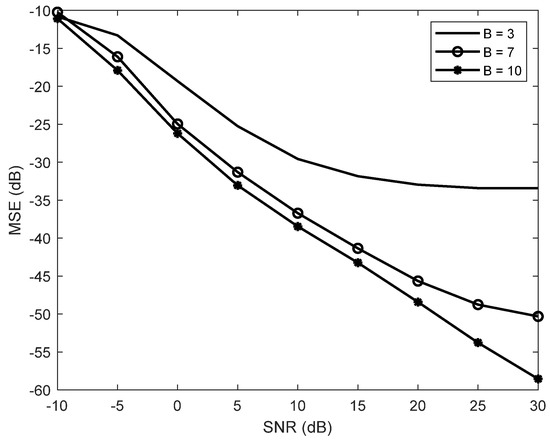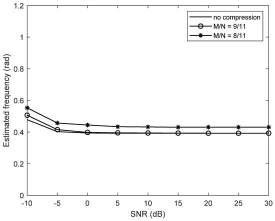 All simulations are averaged over 500 independent runs. The results of the above procedure are demonstrated in Figure 2. It is a plot of the MSE versus SNR for the estimator with no compression corresponding to [27], the estimator of the compressed noisy sinusoid using CCS with compression ratio 9/11 and finally its 6/11 counterpart. The CRLB is also shown. Clearly, as compression increases, performance is degraded. Figure 3 demonstrates the MSE versus SNR for only one compression ratio (9/11) but for different values of the number of blocks B. The improvement is clear as B increases. Increasing B may appear to be contradictory to the concept of compression, but in fact, it is not since the average sampling rate is reduced by compression regardless of the length L (=B·N) of the signal, and it is the sampling rate that determines hardware complexity and consequently cost-effectiveness [16]. For the case of compression ratios equal to 8/11 and 9/11, the estimation is acceptable as can be discerned from Figure 4, which shows the estimated frequency versus SNR, although these LSRs are not minimal. The LSR with a compression ratio of 8/11 was implemented with the set {0, 1, 3, 5, 6, 7, 8, 10}. The compression ratio 8/11 also results in an estimation bias of 0.038 rad (or 0.006 times the sampling frequency). This is clear from Figure 4. The advantages of compression may outweigh the disadvantage of reduced accuracy depending on the application.