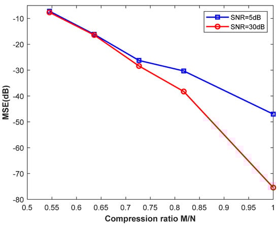 Frequency estimation mean square error versus compression ratio, the colored noise case, for SNR = 5 dB and SNR = 30 dB..