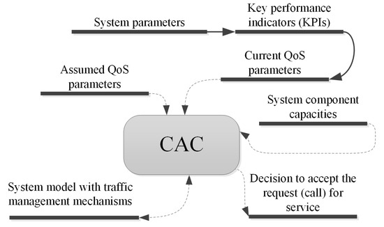 Over the recent years, the growing number of offered services executed with the application of network resources is clearly observable. Consequently, this causes an increase in network traffic, which in turn defines one of the main traffic problems related to the provision of optimal access to network resources for demands (calls) of different traffic classes. A decision as to the admittance of a new call is made by the call admission control (CAC) function on the basis of the traffic parameters and the demanded QoS (Quality of Service) parameters of both the arriving call and those calls that are already being serviced (Figure 1). The efficiency of the CAC function is associated with the assumed allocation algorithm for the allocation of the network resources to particular calls of different traffic classes. One of the possible and most effective strategies of the CAC function is resource reservation [8,9,10] for pre-defined traffic classes. As a result, its application can provide appropriate and required service quality for the traffic streams that are related to a given traffic class.