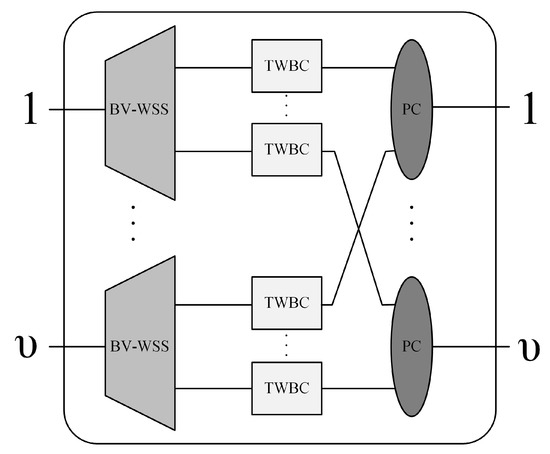 A first/third stage switch. BV-WSS—bandwidth variable wavelength selective switch; TWBC—tunable waveband converter; PC—passive combiner.