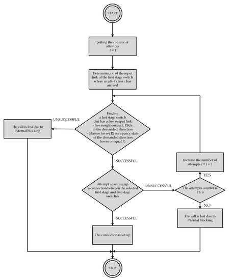 With the point-to-point path choice algorithm, a connecting path is set up between a switch of the first stage at the input of which a new call has appeared and a selected switch of the last stage that has a free output link in the required direction. In the implemented reservation mechanism in the output directions, a free output link in the demanded direction for a call of class c is such a call that has at least free, neighbouring FSUs and, additionally in the case of the classes that belong to , the current occupancy state of the system has to be no greater than the reservation threshold . The block diagram of the point-to-point algorithm is presented in Figure 6.