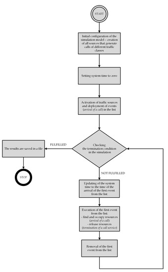 While implementing the simulator using the process interaction method, two events were defined: arrival of a new call and termination of call service. With the case of the event arrival of a new call, it is checked whether a new call can be admitted for service. If this is possible, the resources of the system become occupied; if not, the call is lost. The event termination of call service means that the service of a given call has terminated and the resources of the system are to be released. The execution of the handling of these events in the simulation program is realised by using designated functions. These functions are presented in detail in other publications [16,17], while the general block diagram of the simulation algorithm is shown in the Figure 7.
