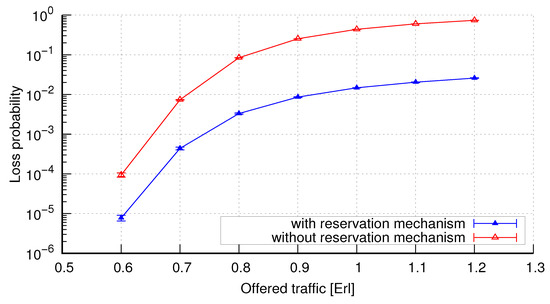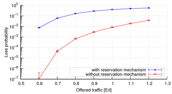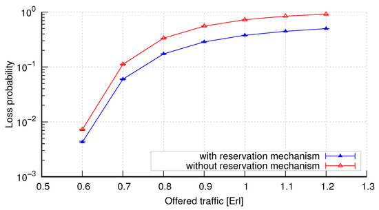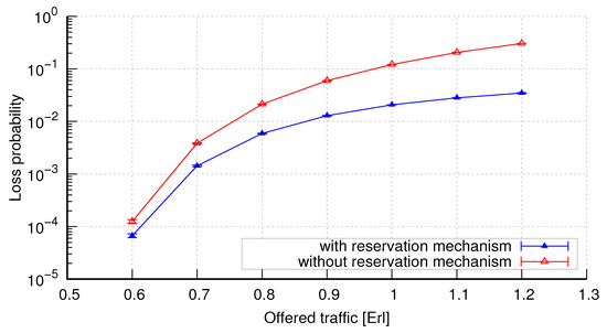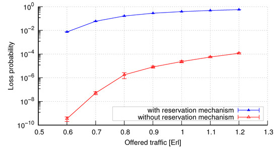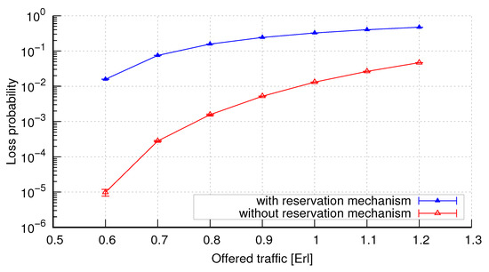 Figure 8, Figure 9, Figure 10, Figure 11, Figure 12, Figure 13 and Figure 14 show the values of the loss probability for calls of individual traffic classes in relation to the traffic value a offered to a single FSU. In the graphs, the values of the loss probability in the system with introduced reservation mechanism and the system without reservation mechanism are compared. It is observable that in the case of the classes that belong to the set , the values of the loss probability increase (in the case of the system with reservation) as compared to the values of the loss probability in the system without reservation (Figure 8, Figure 9, Figure 11 and Figure 12). In the case of the classes that do not belong to the set (privileged classes in the system with reservation), we can observe a decrease in the loss probability as compared to the values obtained for the same classes in the system without reservation (Figure 10, Figure 13 and Figure 14).