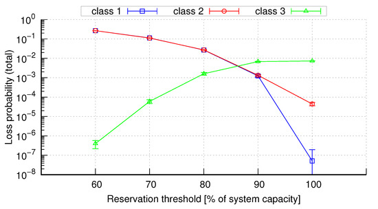 The reservation mechanism was implemented in the considered W-S-W network. The reservation mechanism was applied to the classes that are included in the set . For a given class c that belonged to the set , the reservation threshold was introduced to determine the occupancy state of the system above which calls of class c could not be serviced. This means that, for the remaining traffic classes, all resources of the system will be available. In the case of the switching network under consideration, the reservation threshold determines the occupancy state of the output directions. From the QoS perspective, one can state then that the classes for which no reservation mechanism has been introduced (i.e., those that belong to the set ) can be treated as privileged classes.