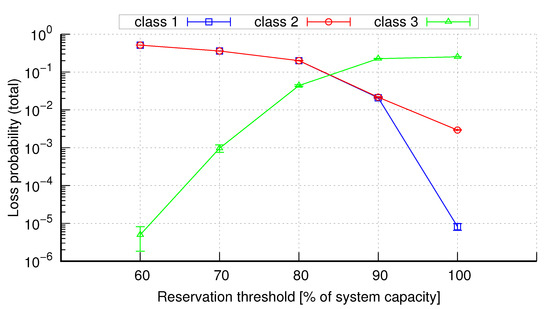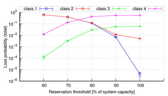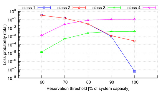 Additionally, a study on the influence of the value of the reservation threshold on the values of the loss probability obtained for calls of particular traffic classes in the switching network with reservation was performed. The results of the study are presented in Figure 15, Figure 16, Figure 17 and Figure 18. The analysis of obtained results shows that the values of the loss probability for privileged classes (i.e., those that do not belong to the set ) increase with the increase in the value of the reservation threshold. The increase in the value of the reservation threshold involves a decrease in the volume of resources reserved for privileged classes. On the other hand, in the case of the classes that belong to the set , we can observe a decrease in the loss probability with the increase in the value of the reservation threshold. It is also possible to find such a value of the reservation threshold for which equalisation of the value of the loss probability for calls that belong to the set with one privileged class occurs. In addition, it should be added that in Figure 15, Figure 16, Figure 17 and Figure 18, the value of the reservation threshold that is equal to 100% means that each traffic class has access to all resources of the system (as if it was a system without reservation).