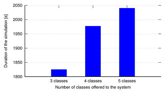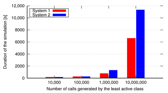 An analysis of the length of the simulation program (of one simulation run) in relation to the required number of generated calls of the least active class was also performed. The results are presented in Figure 20 in the form of a bar chart. The study was performed for the systems presented in Table 1 and the value of traffic is offered to a single FSU. The analysis of the results reveals that along with the increase in the number of generated calls, the duration time of the simulation also significantly increases.
